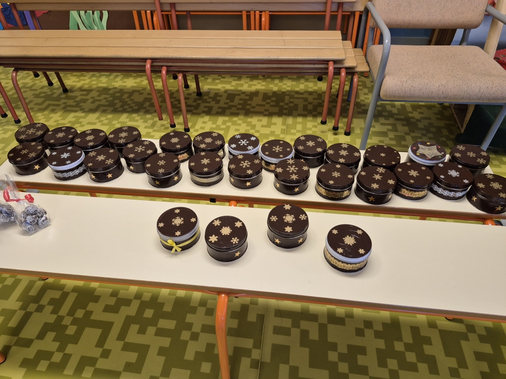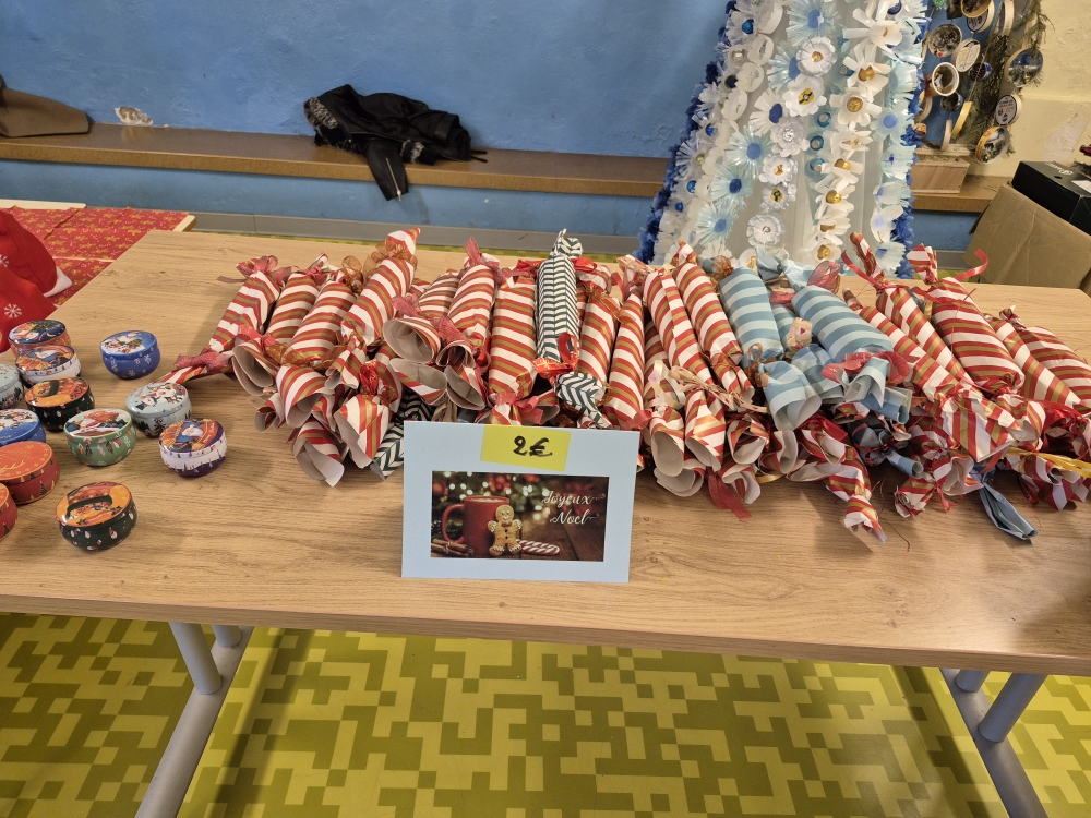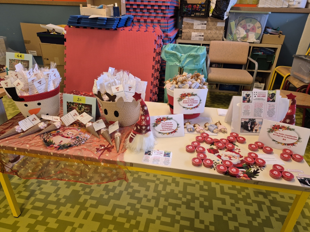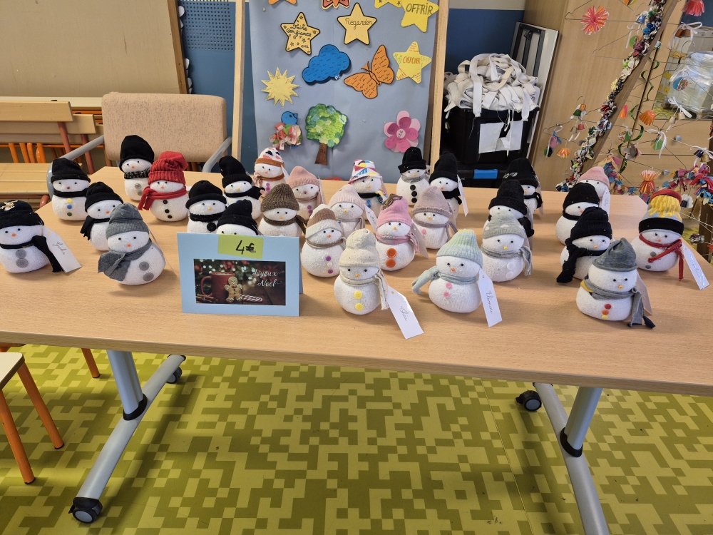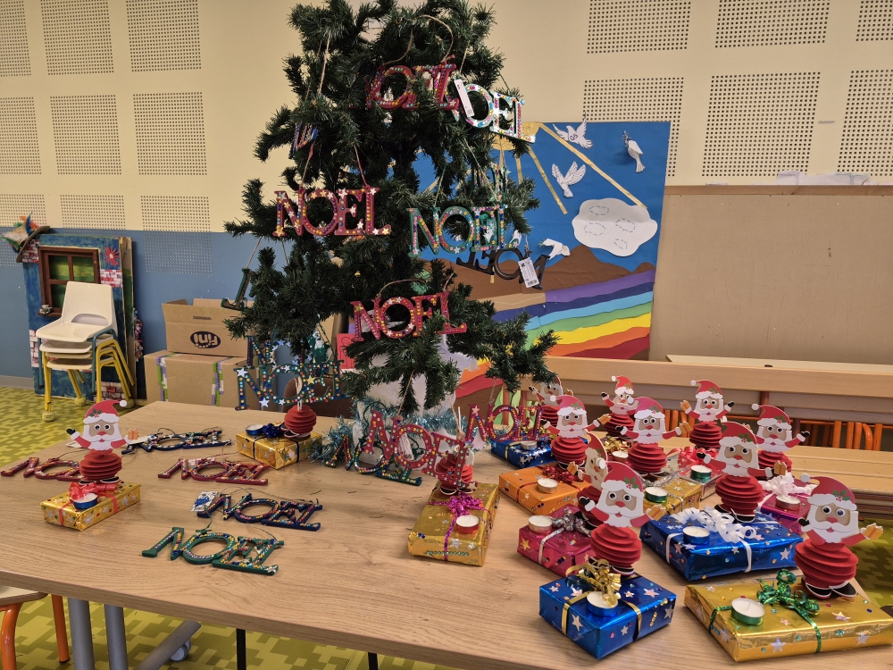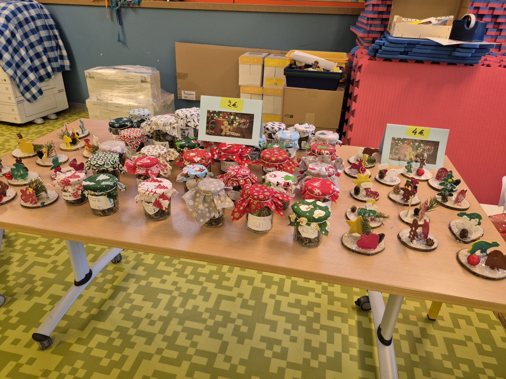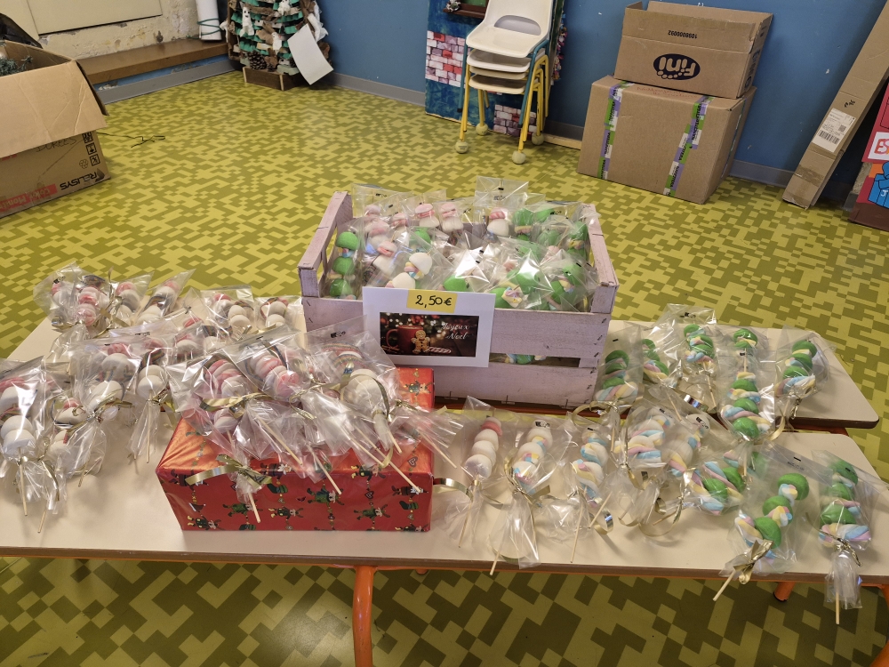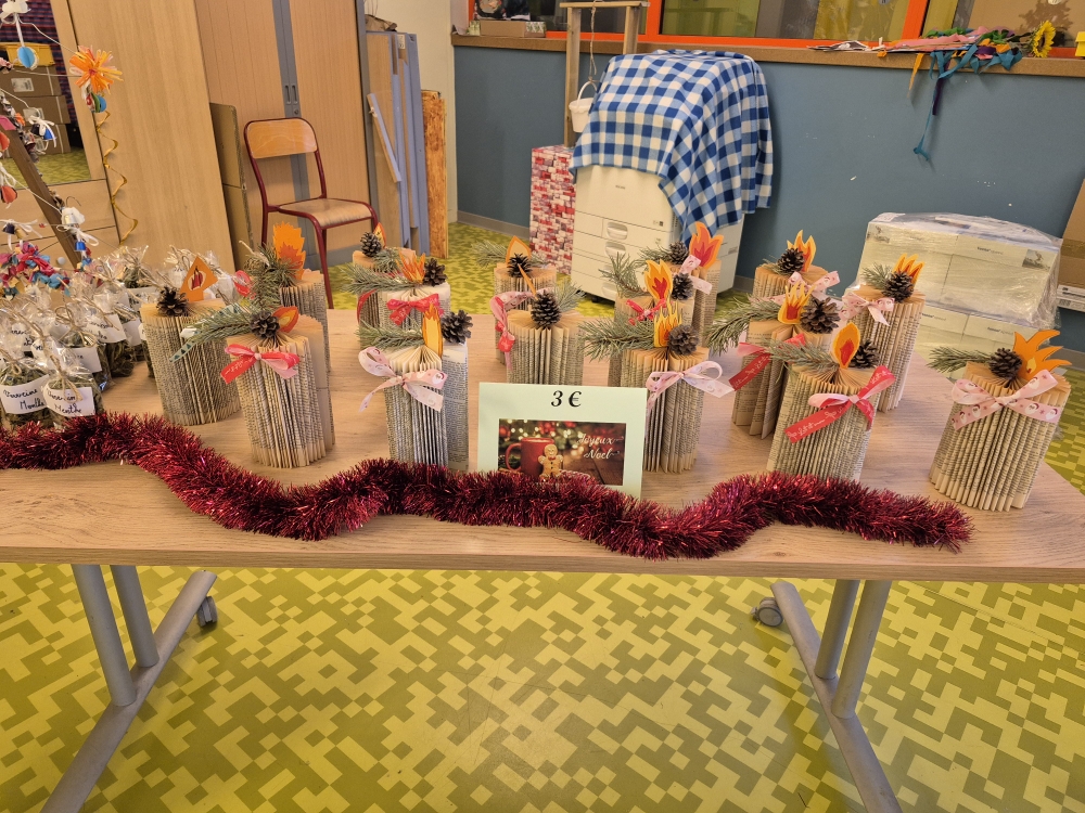 Le marché de Noël est constitué d’objets réalisés par toutes les classes. A 16 heures 45, la chorale de Noël se met à chanter des chants de Noël jusqu’à17 heures. Ensuite le marché ouvre. Cette année, les CM2 avaient fait de petites figurines en bois peintes avec les petites sections. Toute la classe de CM2 avait réalisé des bougies faites avec des pages de livres pliées, des pots de tisanes (décorés par les élèves) à la verveine citronnée, agrémentés de menthe et de zestes d’agrumes. Il y avait d’autres articles créés par les autres classes : brochettes de bonbons, petits bonhommes de neige, des crackers de Noël, des sachets pour préparer des chocolats chauds, … Sans oublier les crêpes à la sortie du marché vendues par les parents d’élèves. Ce marché de Noël était très chargé en objets et réussi. Nous l’avons tous aimé, nous espérons que vous aussi!