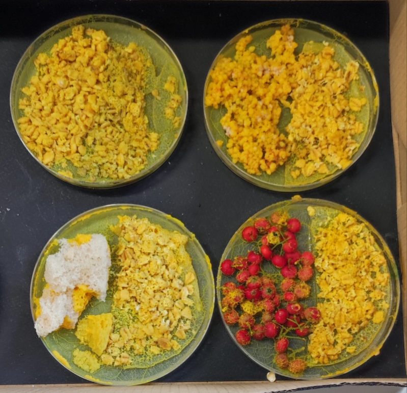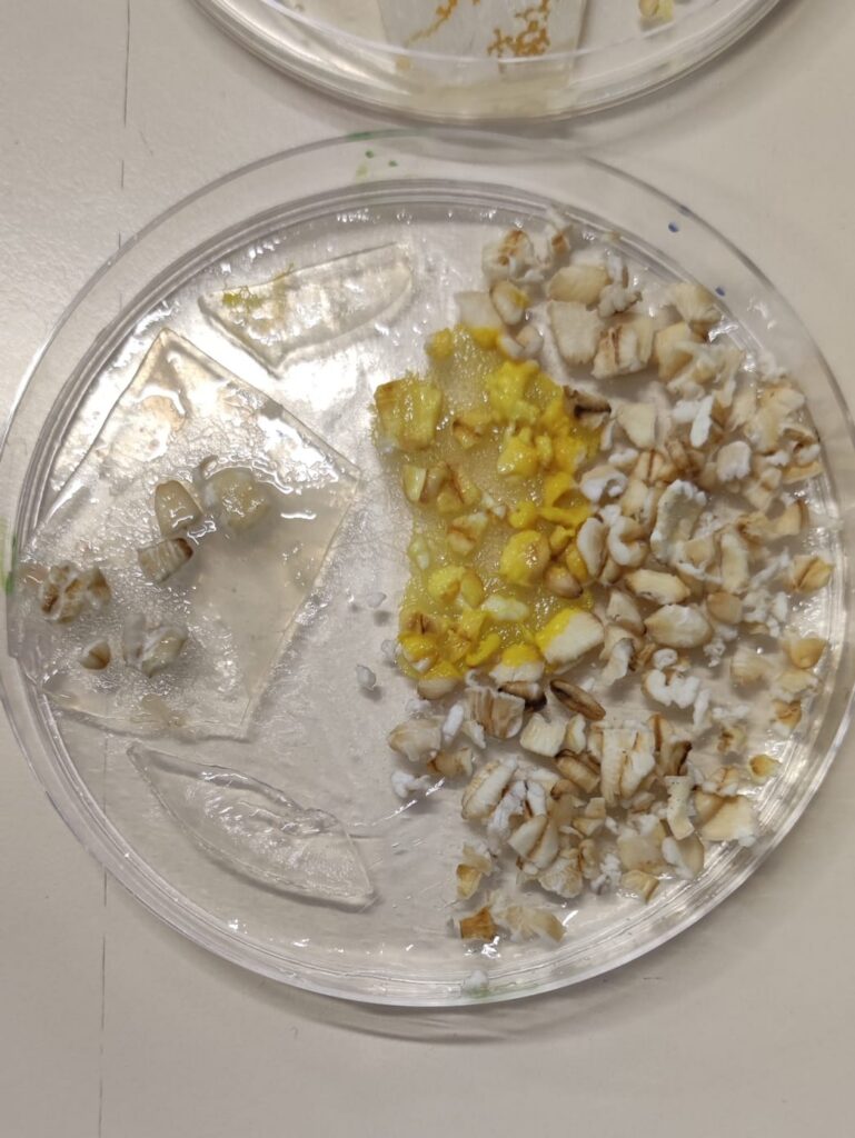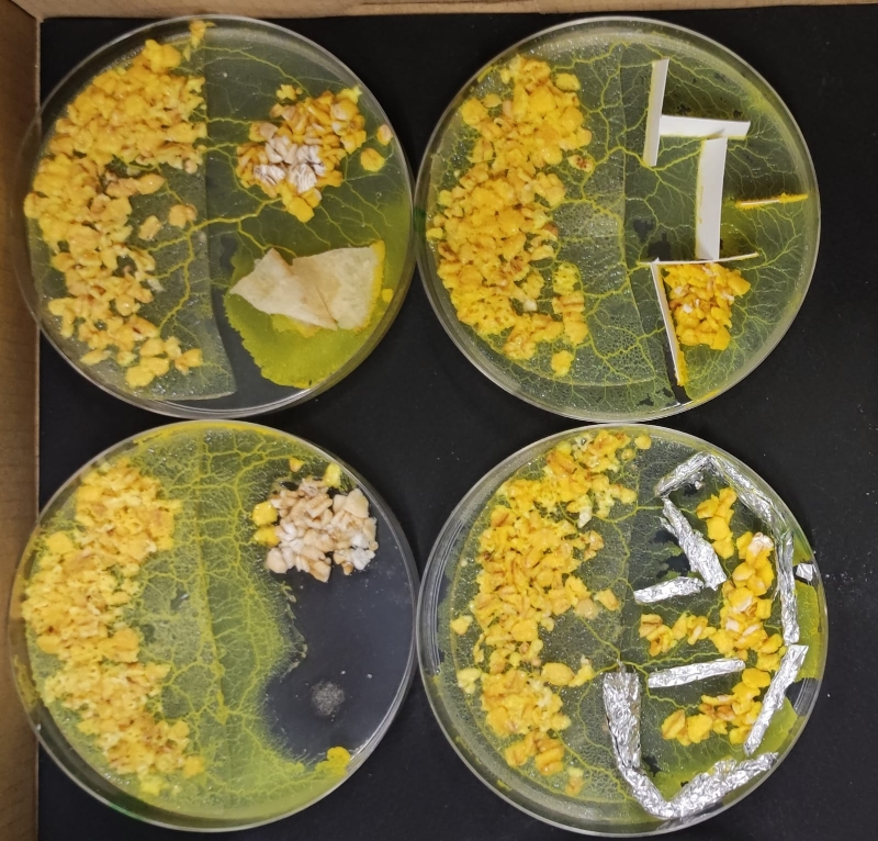 Pour réveiller les blobs, il faut mettre de la gélose sur le couvercle car il est endormi sur du papier filtre à café. Ensuite, il faut lui donner des flocons d’avoine (de l’autre coté de la boite) pour qu’il s’hydrate et s’étale partout.